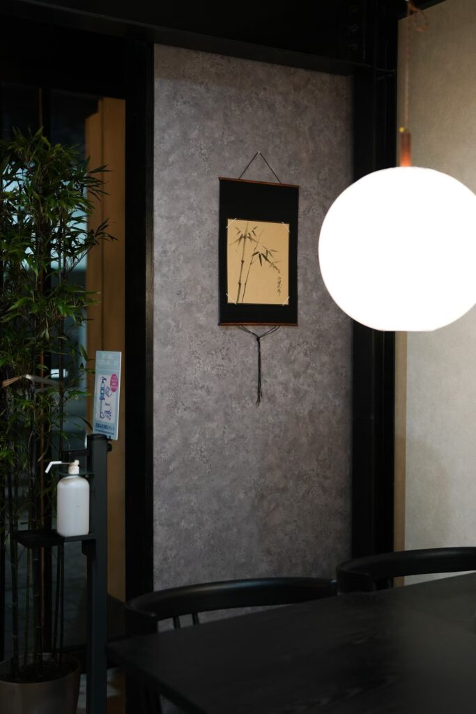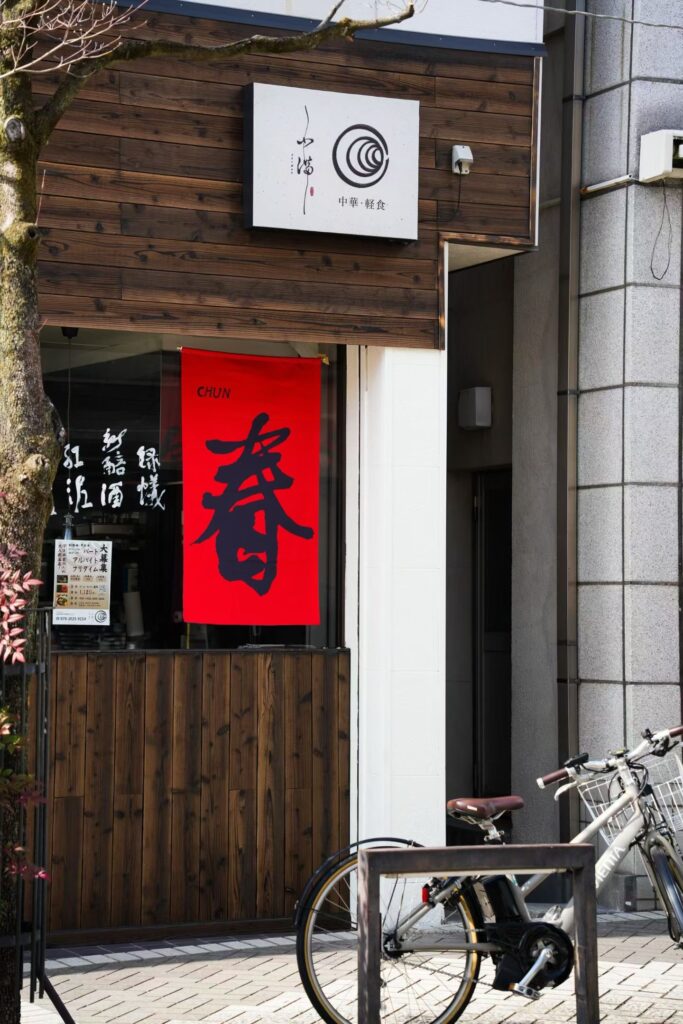 木の温もりを感じる外観に、鮮やかな赤い「春」の文字が描かれた日よけ幕や、風情ある茶色ののれんが目印です。