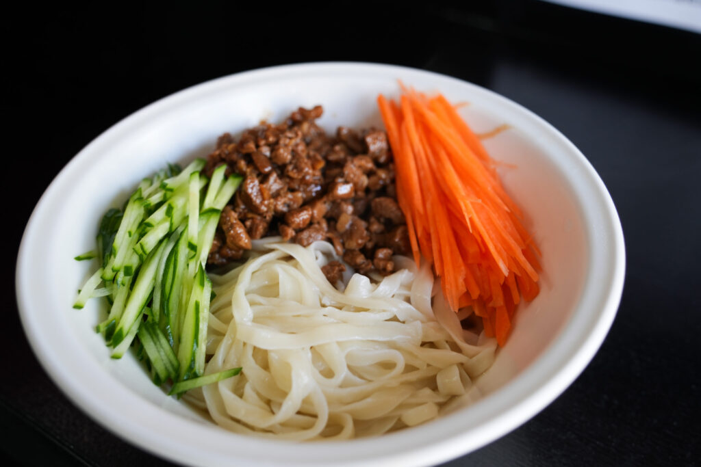 食欲をそそるビジュアルが魅力の人気メニューです。 もっちりとした平打ちの白い麺の上に、甘辛く味付けされたたっぷりの肉味噌、シャキシャキとしたきゅうりと人参の千切りが美しく盛り付けられています。これらを豪快に混ぜ合わせて食べれば、野菜のフレッシュさと肉の旨味が絶妙なハーモニーを奏でます。