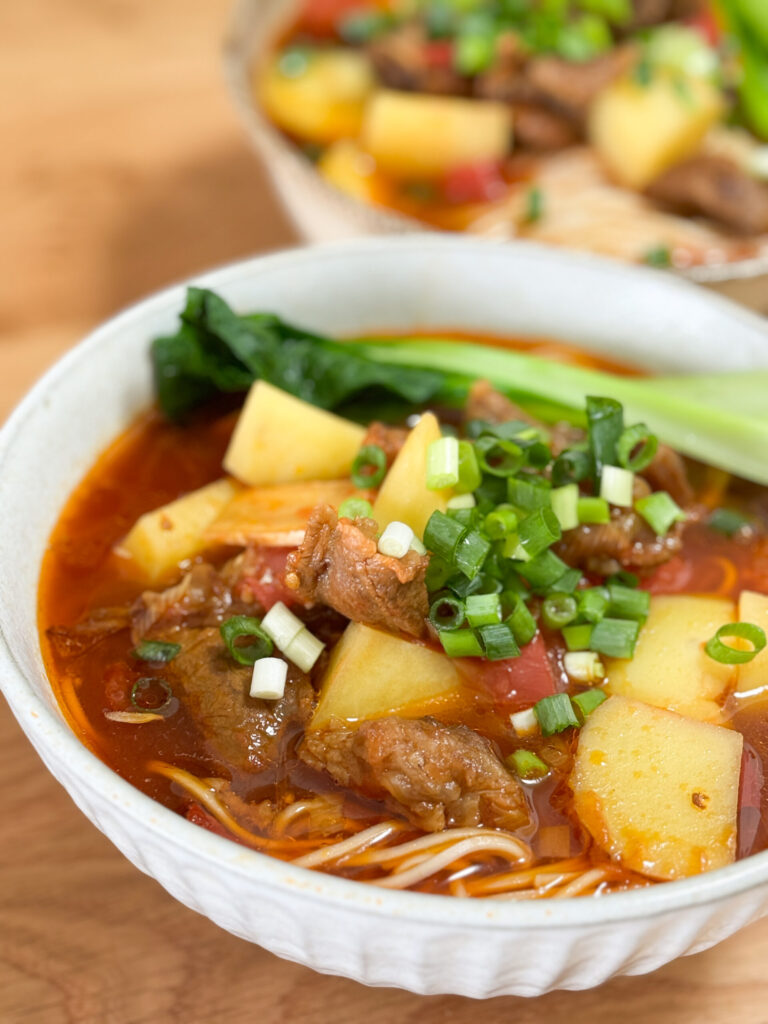 店舗が一番におすすめする至福の一杯です。 じっくりと時間をかけて煮込まれた牛筋は、口の中でほどけるような柔らかさ。赤いスープにはトマトの爽やかな酸味と旨味が溶け出し、ゴロゴロと入った「じゃがいも」が奥深いコクを生み出しています。うどんを思わせるもっちりとした太めの麺が濃厚なスープに絡み、青梗菜やネギの彩りも鮮やかな、ボリューム満点な一品です。