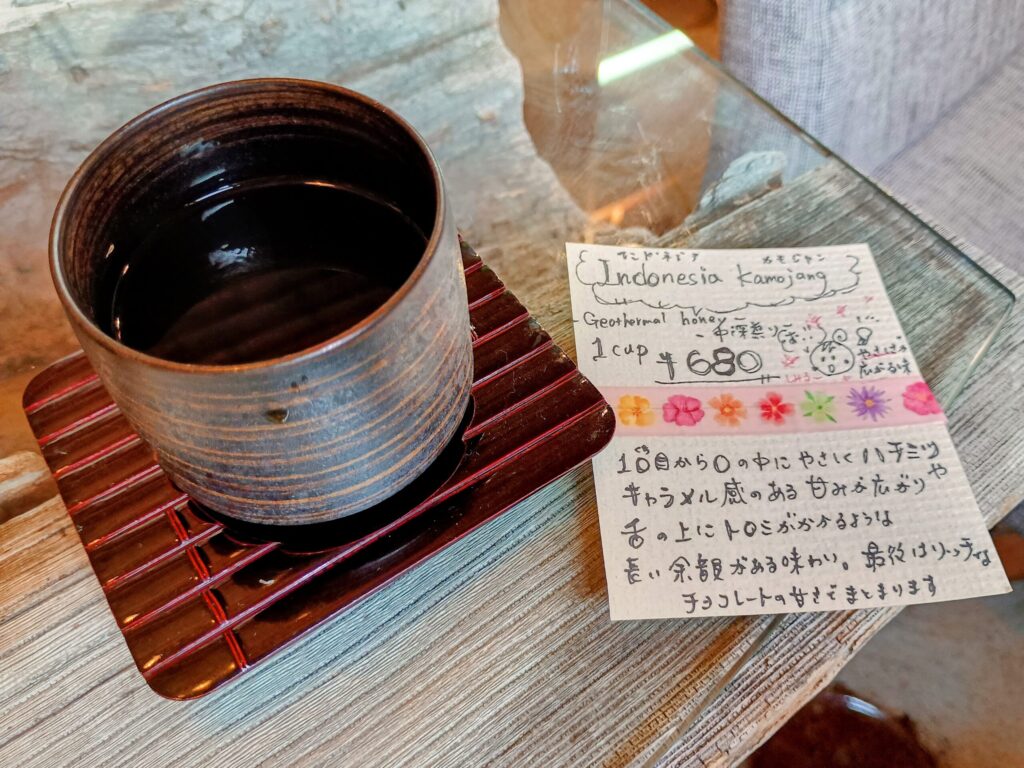 店主: カモジャンはハチミツやナッツのような柔らかい甘みがあって、香りも長く続くのが特徴です。コーヒーの器にもこだわっていて、これは「香酒盃(こうしゅはい)」という焼酎用のカップなんですよ。香りが2倍に感じられる作りになっています。